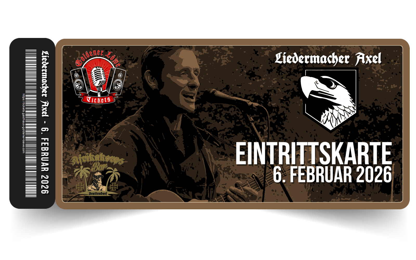 Für die beiden Abende müssen keine Tickets erworben werden. Der Eintritt ist Gratis. Bitte nur einen Tisch im Eisernen Löwen reservieren und die Anzahl der Personen durchgeben, die ihr mitbringen wollt. Beginn ist jeweils ca. 19 Uhr - Ende 22 Uhr. | |